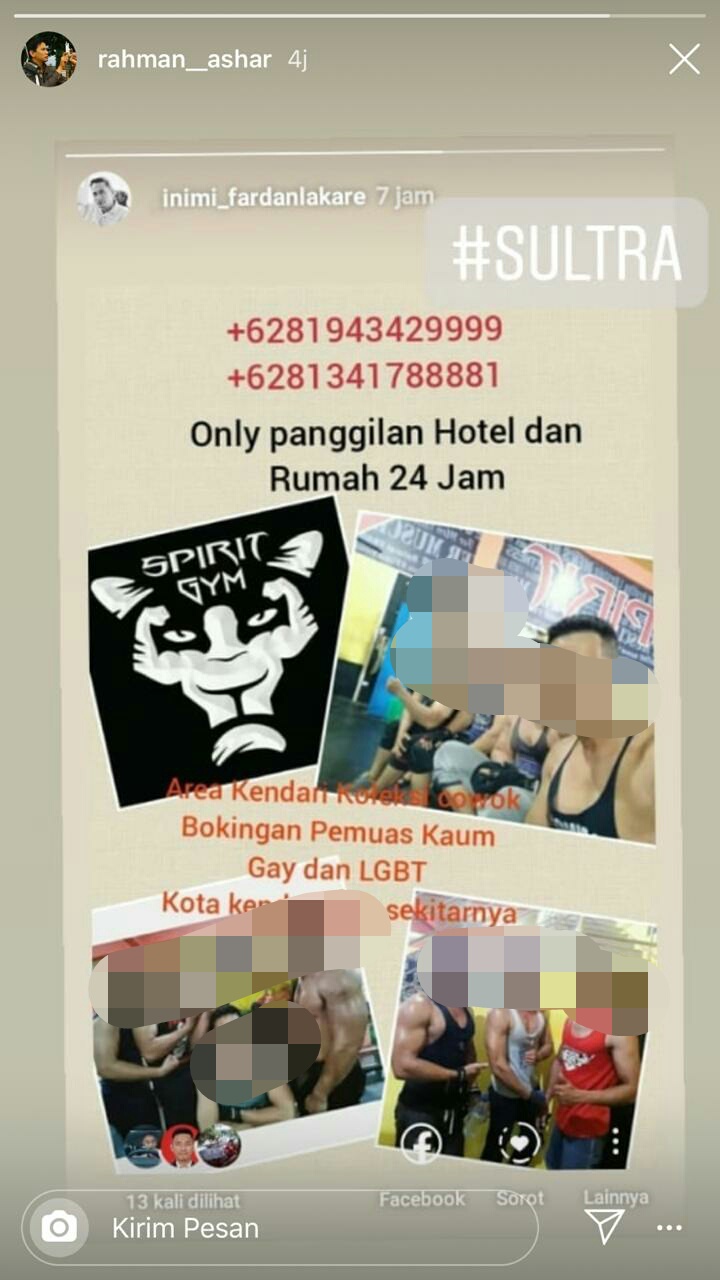 Lebih lanjut, Ia menjelaskan, gambar yang diposting akun rahman_ashar memuat tulisan bahwa Spirit Gym menyediakan laki-laki bokingan, begitu pula terhadap Sanggar Debbi, diilustrasikan menyediakan perempuan bokingan.