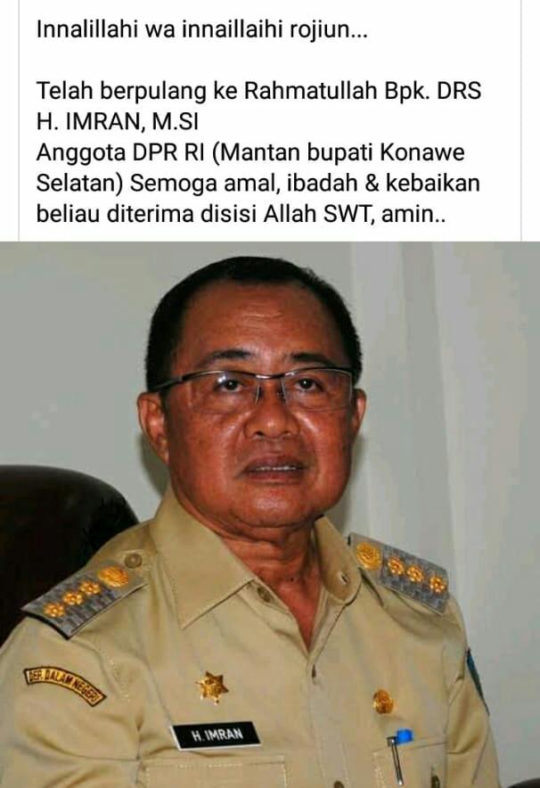 TenggaraNews.com, KENDARI – Mantan Bupati Konawe Selatan (Konsel), Imran meninggal dunia di RSUP Bahteramas, Sabtu 28 Maret 2020 sekira pukul 00.08 Wita.