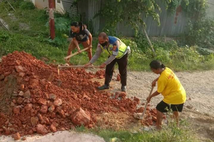 Dengan mengenakan baju seragam polisi dibawah sinar matahari, Askar rela berbaur dengan warga setempat melakukan aksi sosial. Menimbun jalan utama yang terletak kompleks Rukun Tetangga (RT) 03/RW07, BTN Permata Anawai.