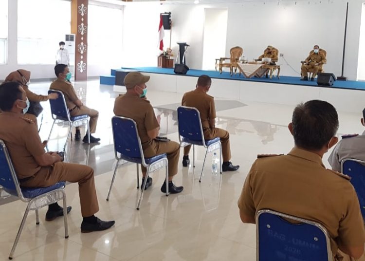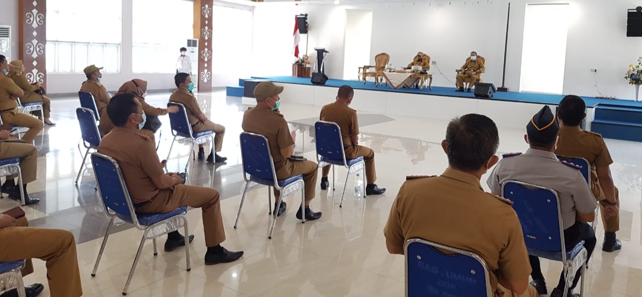 Mengawali hari kerjanya usai cuti 70 hari, Bupati Surunuddin langsung tancap gas dengan memimpin rapat koordinasi (Rakor) peningkatan disiplin dan evaluasi kinerja Aparatur Sipil Negara (ASN) di ruang Auditorium lantai III Kantor Bupati, Senin 7 Desember 2020.