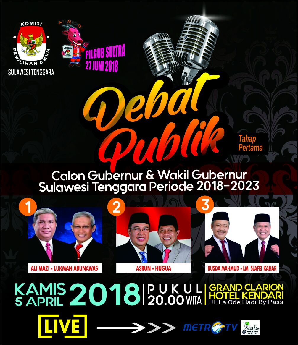 TenggaraNews.com, KENDARI – Tiga pasangan calon (Paslon) Gubernur dan Wakil Gubernur Provinsi Sulawesi Tenggara (Sultra) akan beradu gagasan melalui debat publik putaran pertama, yang diselenggarakan Komisi Pemilihan Umum (KPU), Kamis 5 April 2018 di Grand Clarion Hotel & Convetion Kendari.