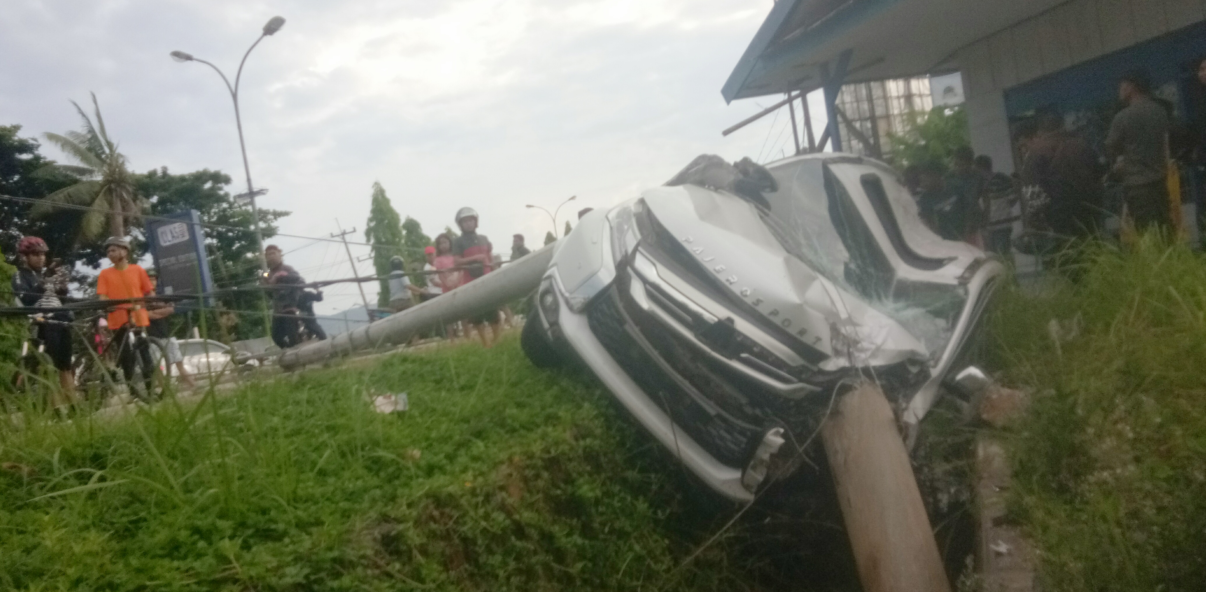 TenggaraNews.com, KENDARI – Sebuah mobil Pajero Sport berwarna putih tanpa nomor plat seruduk tiang listrik di bilangan by pass, Jalan Brigjen M. Joenoes, Kelurahan Bende, Kecamatan Kadia, Kota Kendari.