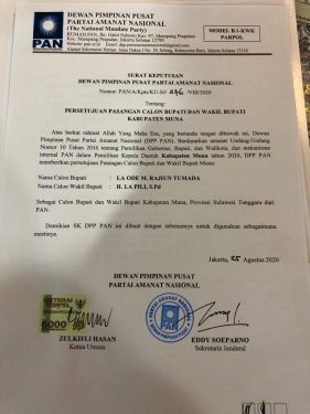 TenggaraNews.com,MUNA-DPP Partai Amanat Nasional (PAN) resmi mengeluarkan surat rekomendasi model B.1-KWK, dengan nomor PAN/A/Kpts/KU-SJ/276/VIII/2020 ke Pasangan LM. Rajiun Tumada-H. La Pili(RAPI )pada 25 Agustus 2020.