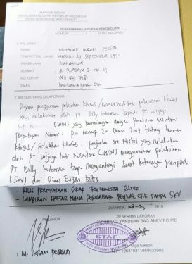 TenggaraNews.com, JAKARTA – Forum Mahasiswa Pemerhati Investasi Pertambangan (Forsemesta) Sulawesi Tenggara (Sultra) laporkan dugaan kongkalingkong ilegal mining yang dilakukan PT. Billy Indonesia dan PT. Wijaya Inti Nusantara (WIN), ke Mabes Polri, Kamis 28 Maret 2019.