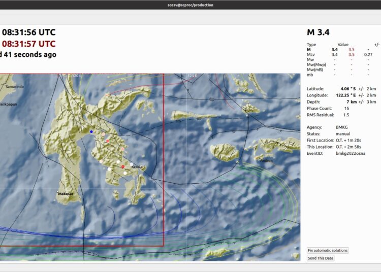 TenggaraNews.com, KENDARI – Gempa  tektonik berkekuatan Magnitudo 3.4 mengoyang wilayah Kabupaten Konawe Selatan (Konsel) sekitar pukul 16:31:56 WITA pada Jumat, 29 Juli 2022.