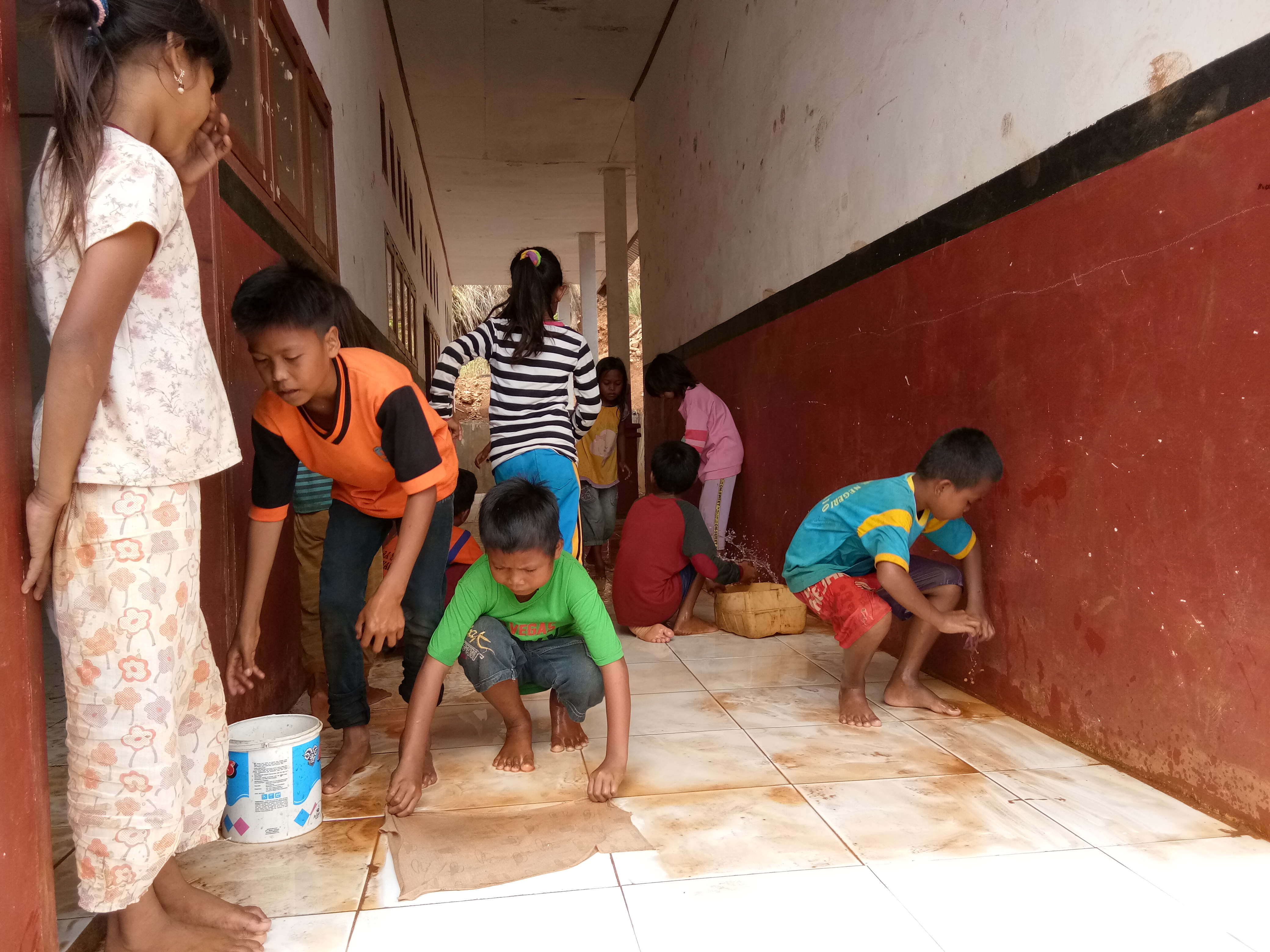 Aktivitas bersih-bersih sekolah yang dilakukan siswa-siswi SDN 3 Lasolo Kepulauan. Foto: Dok. TNC.