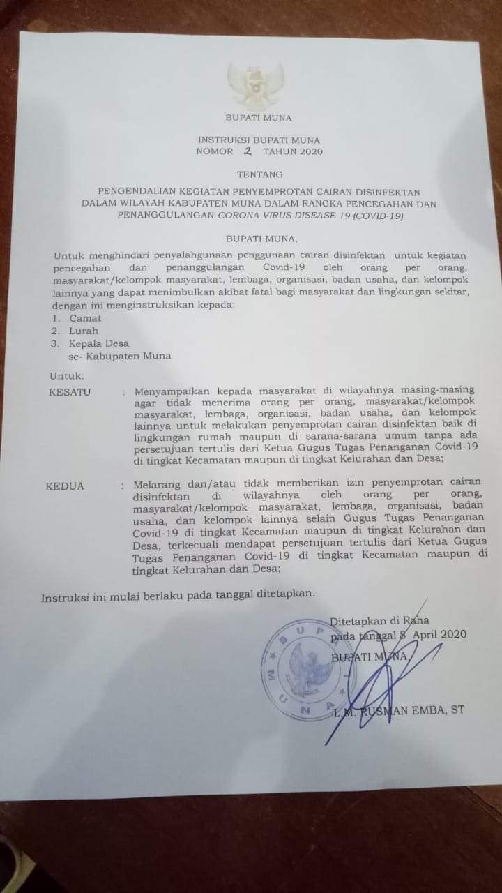TenggaraNews.com, MUNA – Beredarnya instruksi dari Bupat Muna Nomor 2 tahun 2020, tentang pengendalian kegiatan penyemprotan cairan disenfektan di wilayah Kabupaten Muna, dalam rangka pencegahan dan penaggulangan Covid-19, menuai berbagai tanggapan yang pro dan kontra.
