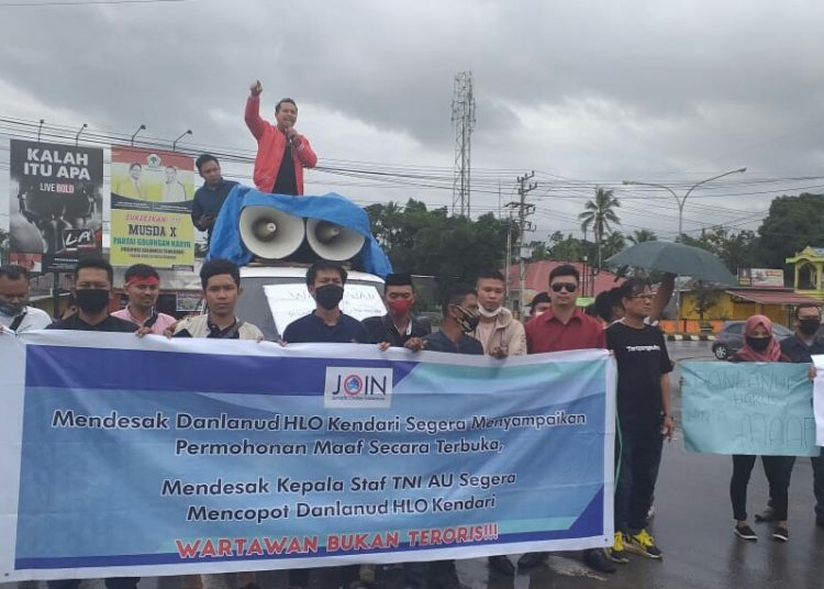 TenggaraNews.com, KENDARI – Dua asosiasi wartawan (jurnalis) di Kota Kendari, Provinsi Sulawesi Tenggara (Sultra), menggelar aksi unjuk rasa menuntut Komandan Pangkalan Angkatan Udara (Danlanud) Haluoleo Kendari, Kolonel Pnb Muzafar agar meminta maaf secara terbuka kepada seluruh wartawan melalui media.