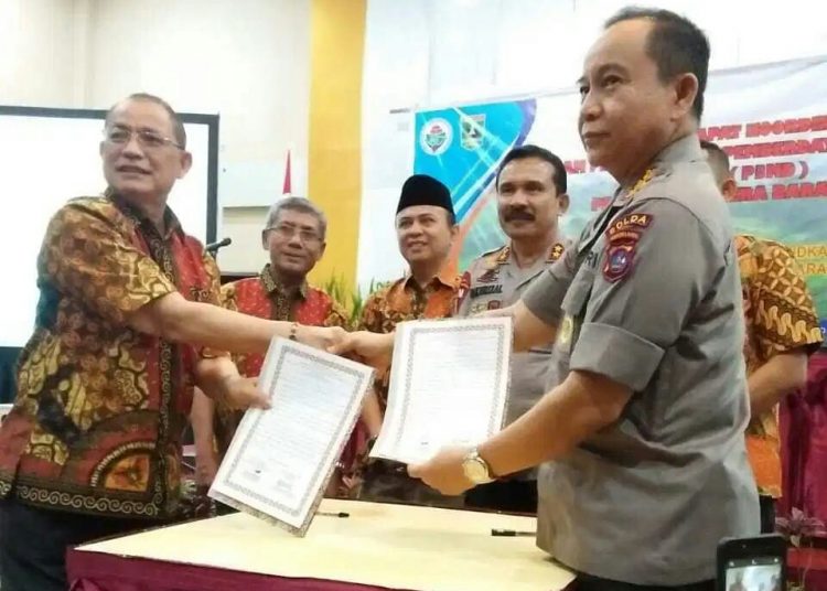 Acara dilanjutkan dengan menandatangani Pembentukan Sekretariat Bersama tentang Pengawasan, Pencegahan dan Penanggulangan Masalah Dana Desa. Dari unsur Polda Sumbar ditandatangani oleh Dir. Bimas Polda Sumbar Kombes Pol Nasrun Fahmi. SH. MSi dan dari DPMD oleh Kadis PMD Drs. H. Syafrizal. MM disaksikan oleh Kapolda Sumbar Irjen. Pol. Drs. Fahkrizal. SH. M. Hum.