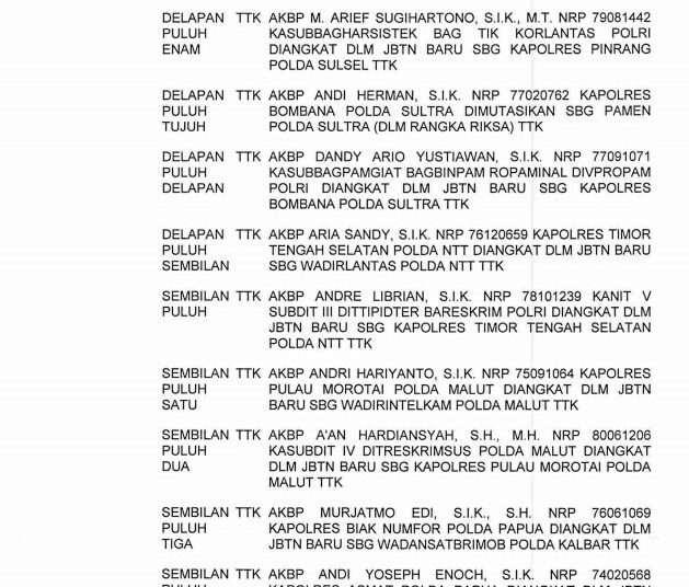 TenggaraNews.com, KENDARI – Kepala Kepolisan Republik Indonesia (Kapolri), Jenderal Polisi Idham Aziz kembali melalukan rotasi jabatan terhadap sejumlah perwira tinggi (Pati) dan perwira menengah (Pamen) Polri.