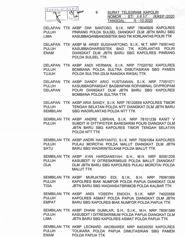 Rotasi jabatan tertuang dalam surat telegram Kapolri Nomor ST / 2933 / X / KEP. / 2020 dan ST / 2934 / IX / KEP. / 2020 serta ST / 2935 / X / KEP. / 2020, tertanggal 13 Oktober 2020.