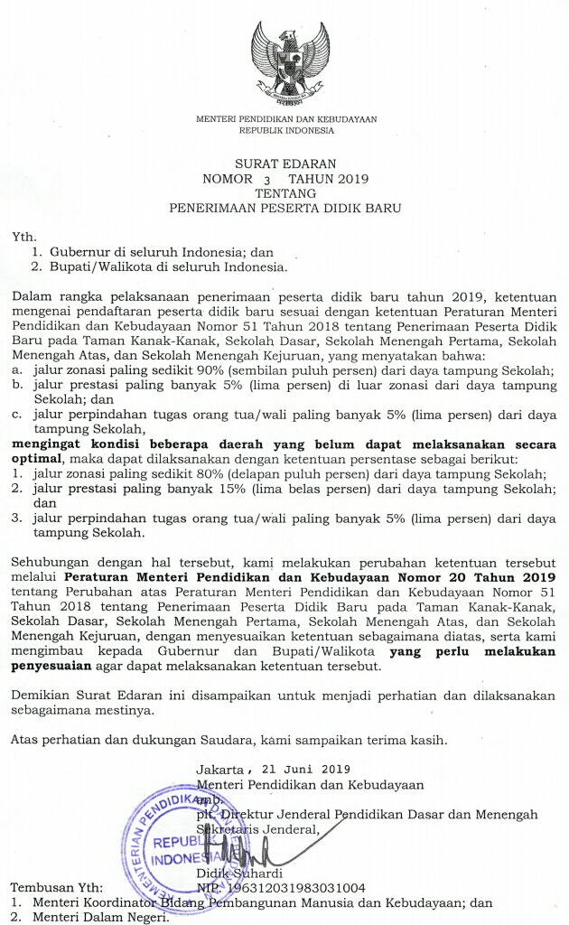 Penyesuaian kuota tersebut dituangkan dalam Surat Edaran Menteri Pendidikan dan Kebudayaan Nomor 3 Tahun 2019 tentang penerimaan peserta didik baru. Surat Edaran diterbitkan dengan adanya Permendikbud Nomor 20 Tahun 2019 sebagai perubahan atas Permendikbud Nomor 51 Tahun 2018, tentang penerimaan peserta didik baru.