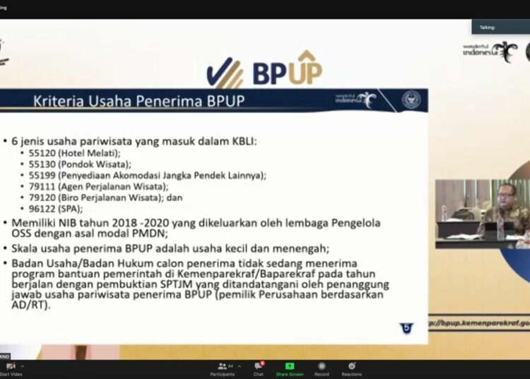 TenggaraNews.com, KENDARI – Kementerian Pariwisata dan Ekonomi Kreatif/Badan Pariwisata dan Ekonomi Kreatif menyosialisasikan aplikasi Bantuan Pemerintah bagi Usaha Pariwisata (BPUP) 2021 sebagai upaya mempermudah penyaluran bantuan bagi pelaku pariwisata dan ekonomi kreatif dari sisi pendataan dan mekanisme distribusinya.