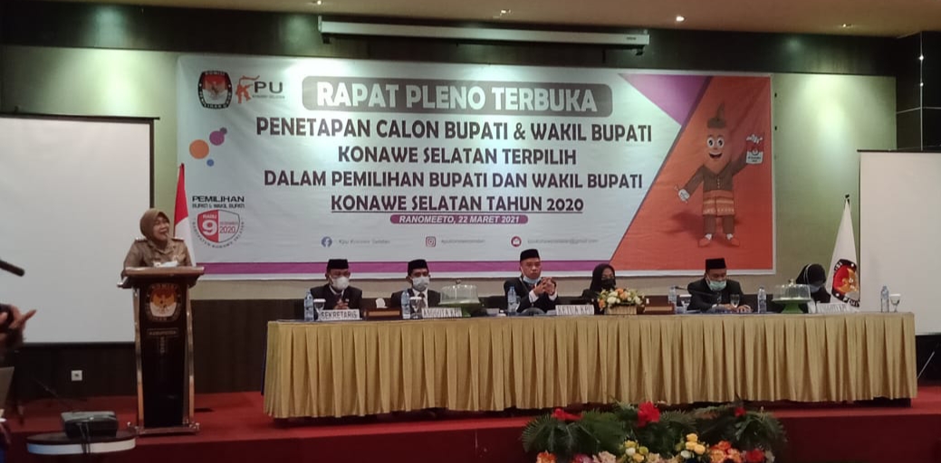 TenggaraNews.com, ANDOOLO – Komisi Pemilihan Umum (KPU) Konawe Selatan (Konsel) menetapkan pasangan calon terpilih Surunuddin Dangga ST,MM dan Rasyid, S.Sos,M.Si sebagai Bupati dan Wakil Bupati Konsel, dalam forum rapat pleno yang digelar di Hotel Wonua Monapa di Ranomeeto, Senin 22 Maret 2021.