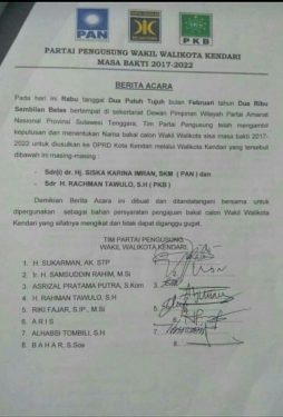 “Rekomendasi dua nama itu sudah ditandatangani Riki Fajar selaku Sekretaris PKS Kota Kendari, dimana ketua PKS dijabat Sulkarnain Kadir yang juga saat ini menjabat Walikota Kendari. Seharusnya sebagai pembina politik di Kota Kendari harus paham etika politik berkoalisi,” tegas Hendra yang juga masuk dalam tim sukses pendukung ADP-Sul tahun 2017 lalu.