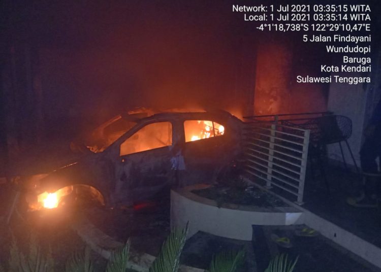 TenggaraNews.com, KENDARI – Mobil milik Sri Mulyani jenis sedan Mitsubishi, hangus terbakar di garasi mobil sekira jam 03.00 WITA dini hari, Kamis 1 Juli 2021.