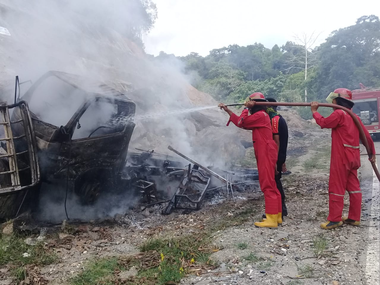 “Ya pada saat saya melihat ke belakang, api tiba-tiba muncul dari bak belakang, karena api dengan cepat membesar, maka saya bersama teman saya melompat dari dalam mobil, hingga mobil jalan sendiri menabrak batu sebelah kanan.