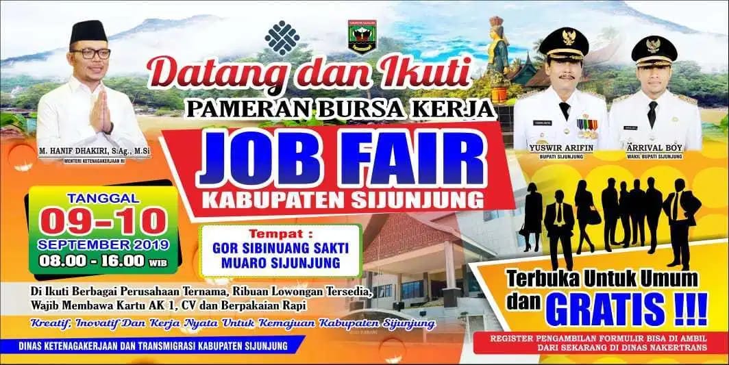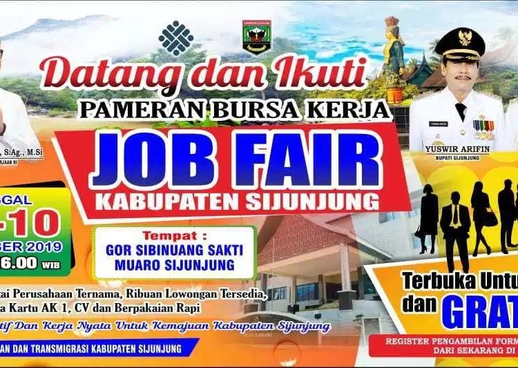 TenggaraNews.com, SIJUNJUNG – Pemerintah Kabupaten Sijunjung melalui Dinas Ketenagakerjaan dan Transmigrasi setempat akan menggelar pameran bursa kerja (Job Fair) di GOR Sibinuang Sakti Muaro Sijunjung.