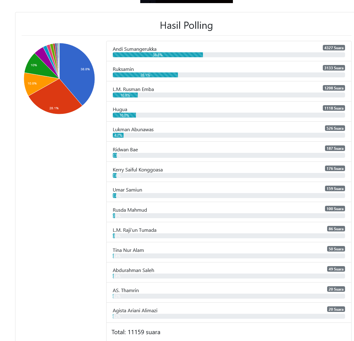 Diperingkat 6, Kery Saiful Konggoasa mendapat dukungan poling 176 suara atau 1,6 persen. Dan Umar Samiun memperoleh dukungan 159 suara atau 1,4 persen.