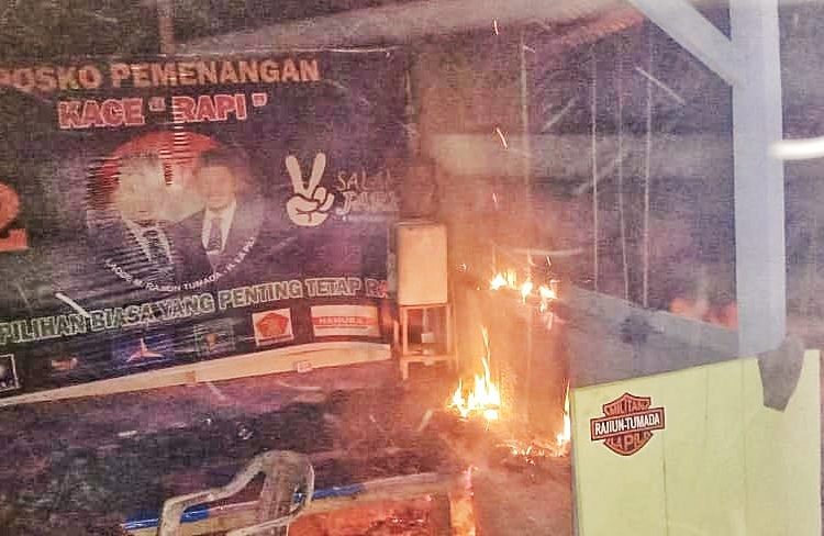 TenggaraNews.com,MUNA-Pos Komando (Posko) pemenangan pasangan calon bupati Muna LM. Rajiun Tumada-H. La Pili (RAPI) yang terletak di Jalan Bunga Kamboja, Kelurahan Raha III, Kecamatan Katobu, Kabupaten Muna, Sulawesi Tenggara (Sultra) diduga di bakar orang tak di kenal (OTK), Kamis 22 Oktober 2020.