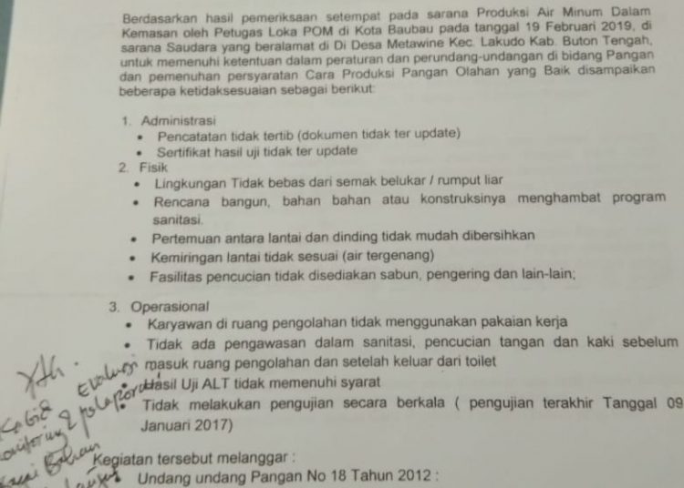 Dalam suratn bernomor : PW O4.01.158.19.594 tanggal 7 Oktober 2019 lalu, perihal peringatan dan tindakan perbaikan dan pencegahan (Capa), pihak BPOM Kota Baubau menemukan berbagai kejanggalan.