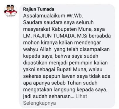 Menanggapi hal itu, Maliki La Ode, Juru bicara Rajiun Center mengatakan, akun pribadi facebook atas nama “Rajiun Tumada” bukanlah akun milik Bupati Muna Barat. Sebab, LM. Rajiun Tumada hanya menggunakan Fanpage (Halaman Facebook).