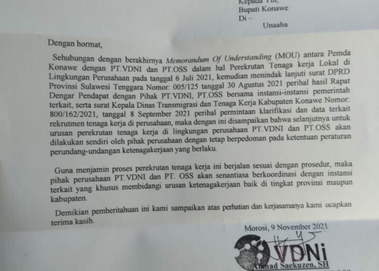 Serta surat Kepala Dinas Transmigrasi dan Tenaga Kerja Kabupaten Konawe Nomor 800/162/2021, tanggal 8 September 2021, perihal permintaan klarifikasi dan data terkait rekrutmen tenaga kerja di perusahaan.